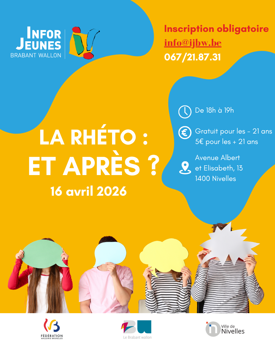 Infor jeunes Brabant wallon avenue Albert et Elisabteh, Nivelles, Brabant wallon, Belgique🎓 Dernière ligne droite avant la fin de la rhéto ? Pas encore sûr·e de ce que tu veux faire après ? Pas de panique ! Lors de cette soirée, on passe en revue toutes les options après la 6e secondaire : 📚 Études, 💼 emploi, 🌍 volontariat, 🔁 année sabbatique, 🛠️ formations… 🗓️ 16… Lire la suite »Séance d’information : Après la Rhéto