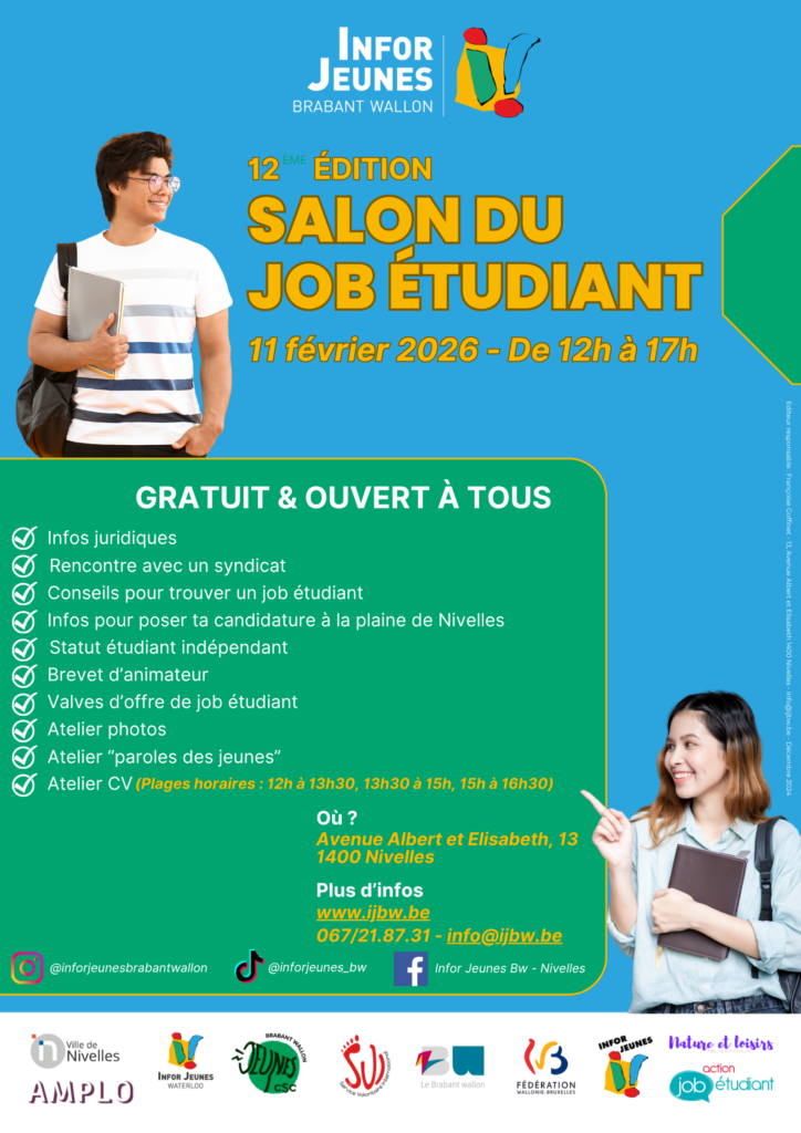 Afin d’apporter aux participants une information optimale, notre équipe sera renforcée par la présence de Nature et Loisirs asbl pour le brevet d’animateur, du Service Jeunesse de la Ville de Nivelles, du Service juridique de la Fédération Infor Jeunes Wallonie-Bruxelles et du syndicat des jeunes CSC.